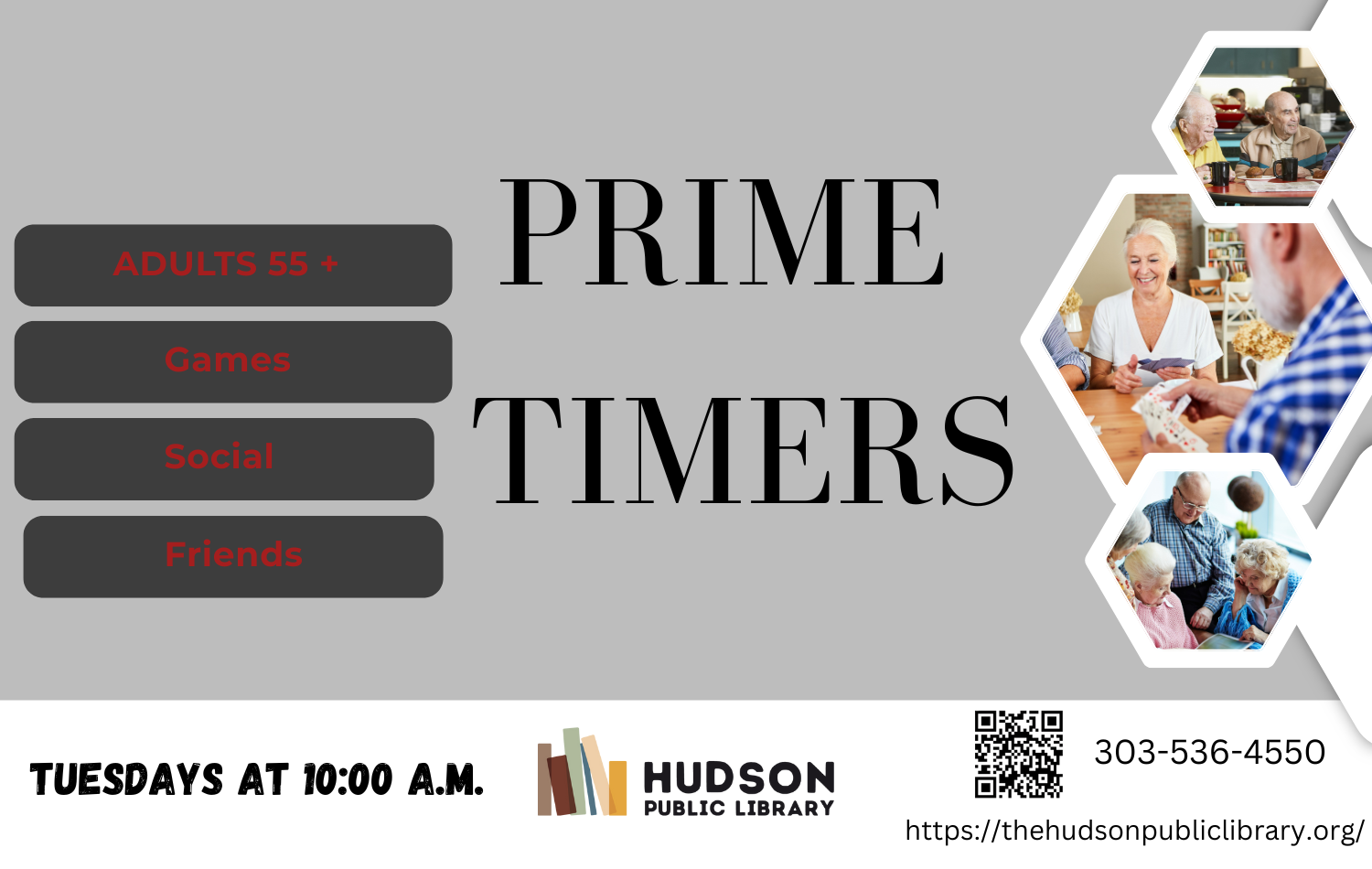 Join the Fun with Prime Timers! Our relaxed monthly meetup for adults 55+ is all about good company, fun games, and great conversation. Whether you’re a regular or new, you’ll feel right at home. Come hang out, make friends, and enjoy something a little different each time! Please call 303-536-4550 if you have any questions or come in during open hours. Please call 303-536-4550 if you have any questions or come in during open hours.