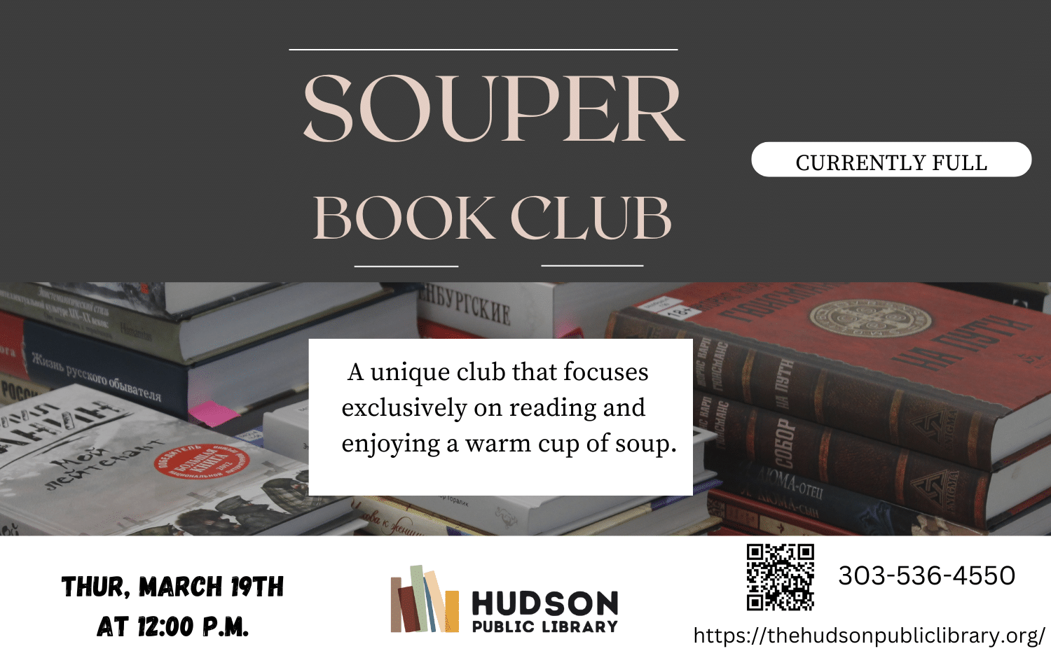 The Souper Book Club meets the third Thursday of every month, from 12:00-1:00pm for a bowl of soup and a lively discussion of our current book. It is a unique club that focuses exclusively on reading debut novels. The goal is to stretch the reading experience beyond normal boundaries and comfort zones and maybe, just maybe find a brand-new favorite author. For adults only. Please call 303-536-4550 if you have any questions or come in during open hours.