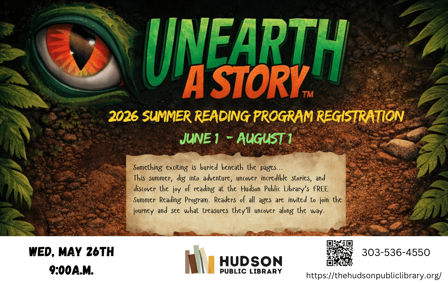 Something exciting is buried beneath the pages! This summer, dig into adventure, uncover incredible stories, and discover the joy of reading at the Hudson Public Library’s FREE Summer Reading Program. Readers of all ages are invited to join the journey and see what treasures they’ll uncover along the way.