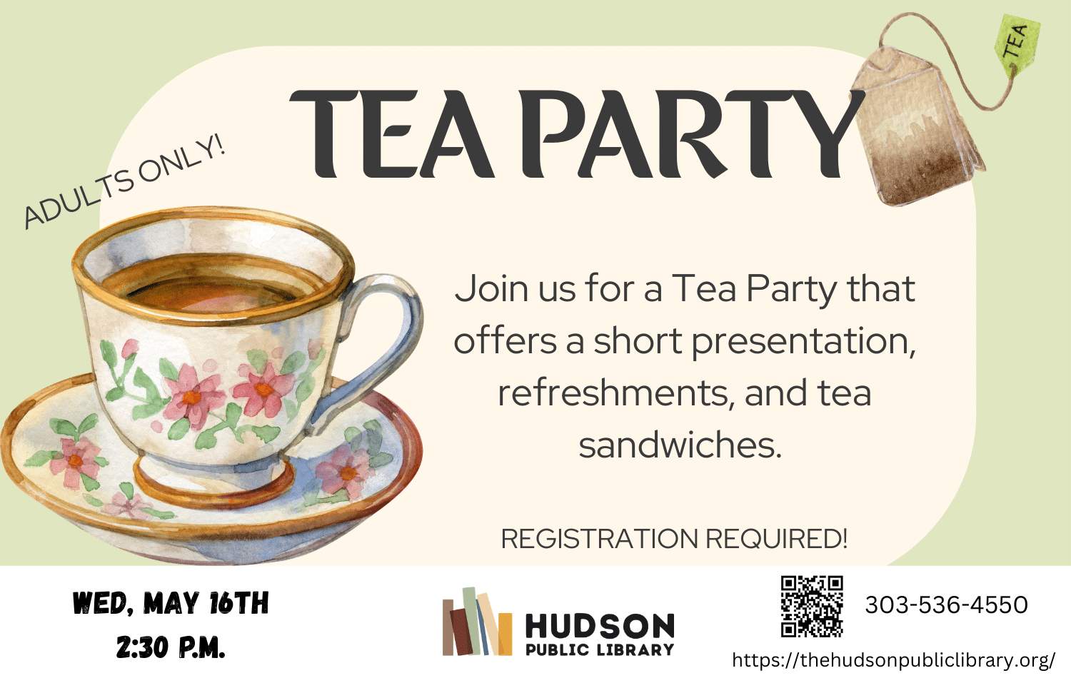 Come make the transition into Spring steeping fun! The Hudson Public Library will hold a fantastic tea party, held with refreshments, snacks, and a short presentation on tea. Come check out this event, and experience a nice tea party!