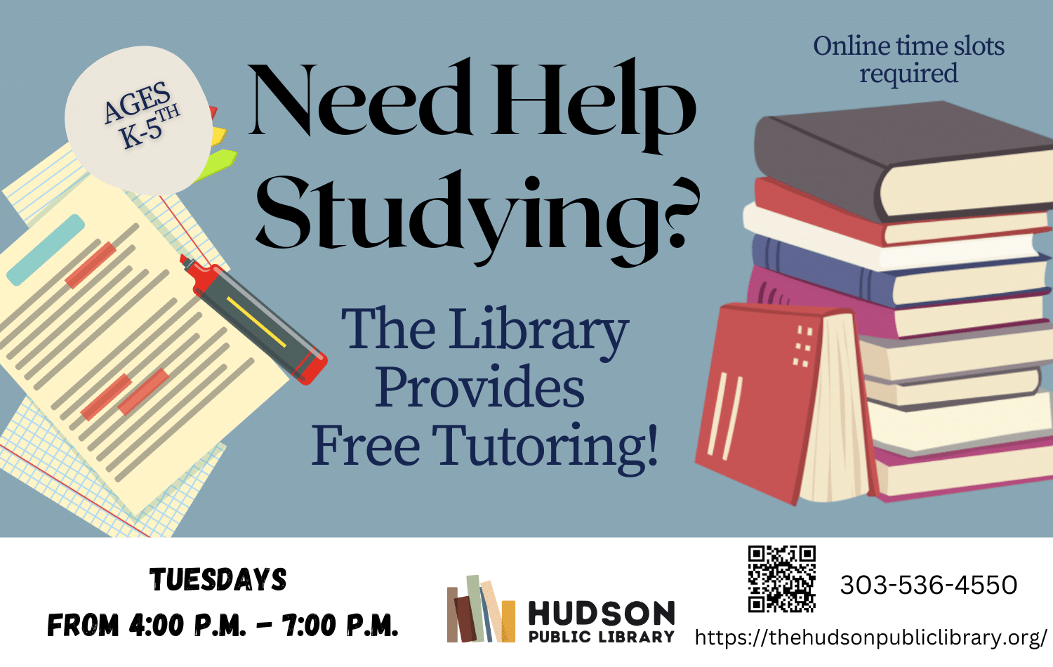 The library now offers FREE tutoring for K–5 students! Join us Tuesdays for help with homework, math, writing, reading, and study skills. Available time slots: 4:00–4:40 PM, 4:45–5:25 PM, 5:30–6:10 PM, 6:15 PM-6:55 PM