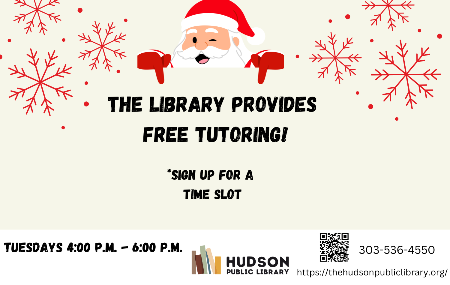 The library now offers FREE tutoring for K–5 students! Join us Tuesdays for help with homework, math, writing, reading, and study skills. Available time slots: 4:00–4:30 PM, 4:35–5:05 PM, 5:10–5:40 PM