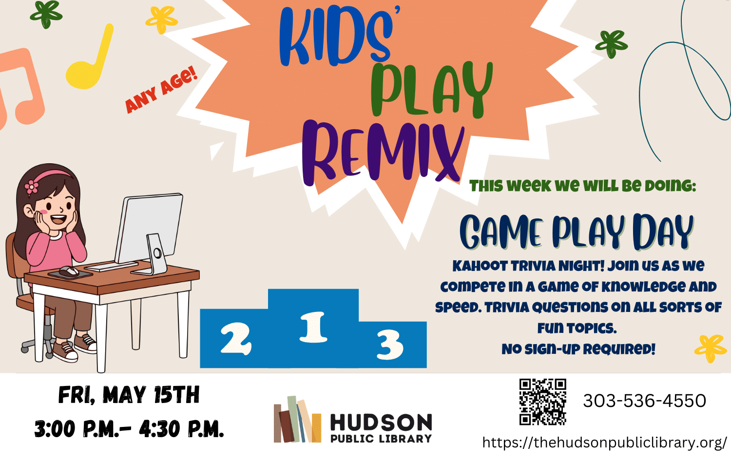 A new, fun and exciting learning opportunity that remixes different themes of play for school-aged children. Each week hosts a different event, so follow closely for all the endless fun! This week, we will be playing Kahoot! Please call 303-536-4550 if you have any questions or stop by during open hours. |